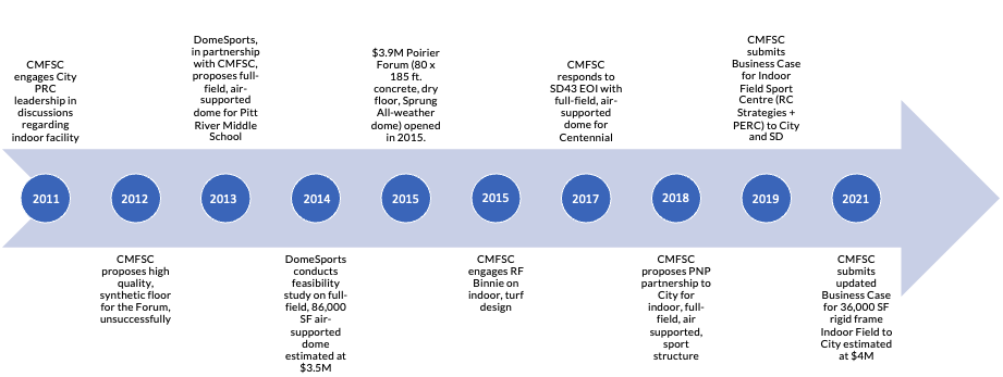 When the City and the School District completed a land swap for the construction of an outdoor, lighted, synthetic turf field at Centennial, the club shifted our focus to developing a business case for a scaled down (36,000 SF), rigid frame, indoor, field-sport centre with RC Strategies, which was submitted to the City of Coquitlam and School District #43 in 2019 and revised and resubmitted to the City of Coquitlam in 2021.