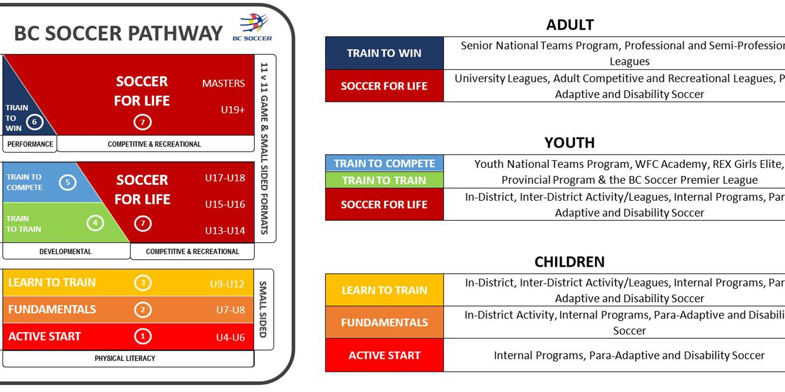 The soccer environment in British Columbia provides a number of opportunities to participate which services players of all age, abilities and levels. To view the High Performance Player Pathway which is the detailed programming within the red section below, please visit the Player High Performance page on the BC Soccer Website. Click here to view the Coaching Pathway. Click here to view the Referee Pathway.